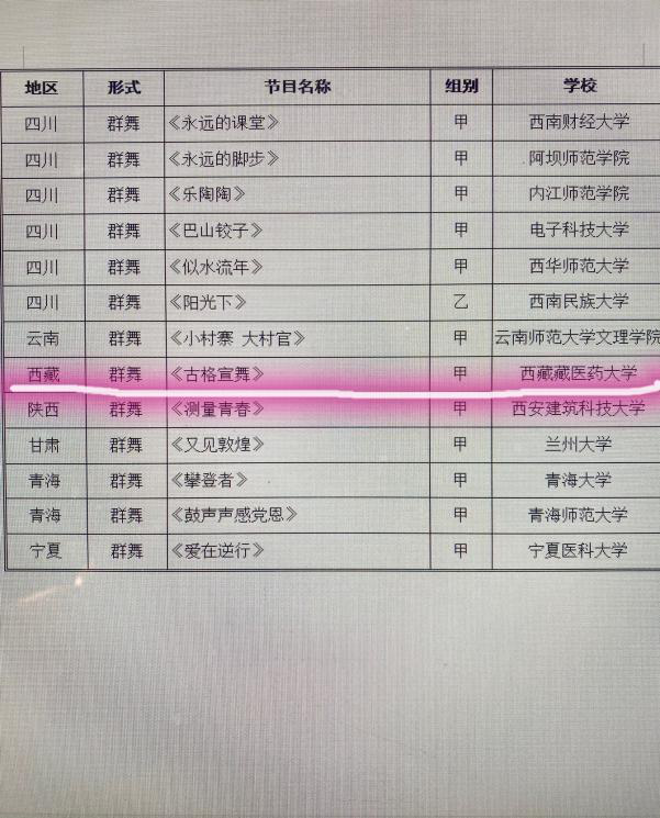38日,教育部体育卫生与艺术教育司公布了“全国第六届大学生艺术展演活动艺术表演类节目现场展演”名单。我校邦金梅朵艺术团藏医系分队报送的群舞《古格宣舞》榜上有名。