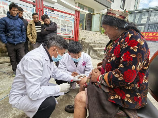 在接下来的两天里,两位专家在驻村工作队与陈塘镇卫生院医务人员的协助下,开展义诊活动,前来咨询和就诊的群众络绎不绝。两位专家仔细倾听病人的叙述,详细询问他们症状,认真诊脉,触摸病痛点,测量血压,耐心分析病情,然后制定治疗方案。陈塘镇卫生院的工作人员根据药方一丝不苟地抓着药,并反复叮嘱病人要按时用药。同时,还用拔罐、火灸、金针温灸、铁烙、放血等传统外治疗法予以治疗。专家嘱咐陈塘镇卫生院工作人员,对重点病人后期要跟踪了解,及时反馈疗效。近两天的时间里,共诊治了400余人次,免费发放了60多种、4万余元的常用藏药和名贵藏药。在义诊活动期间,专家还针对特殊病例展开实践教学活动,对陈塘镇卫生院人员边诊治边教学,提高他们的医疗水平。