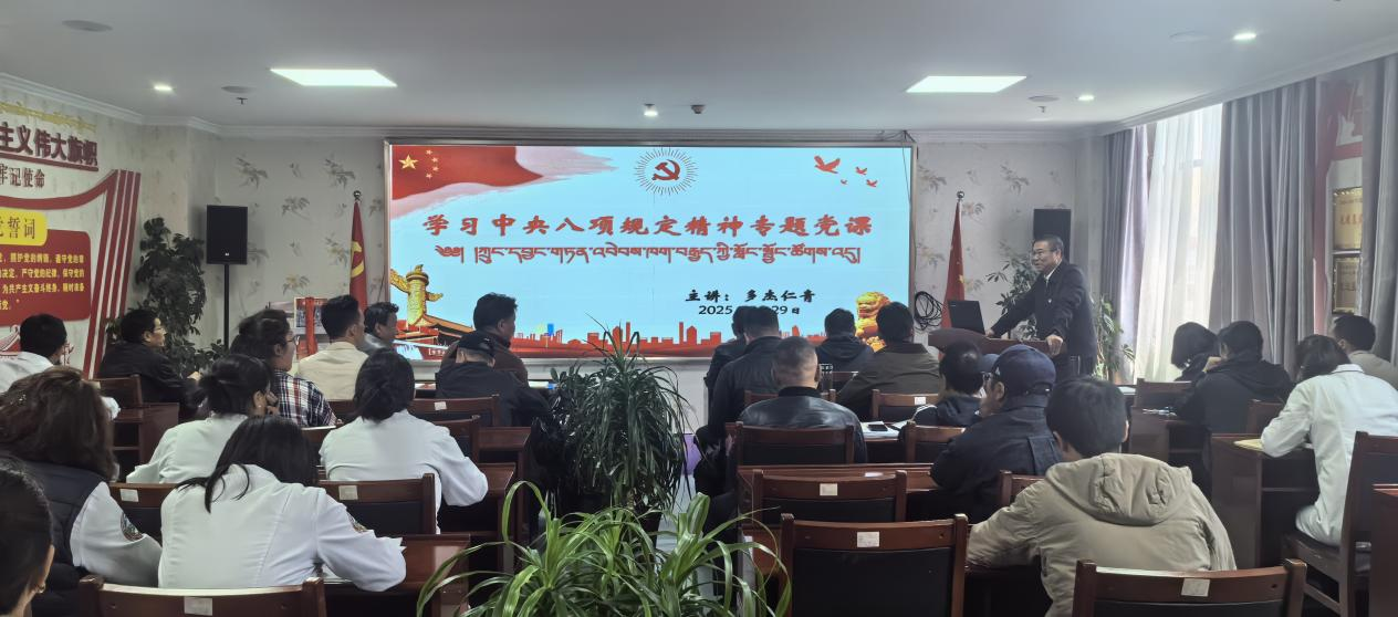 推动深入贯彻中央八项规定精神学习教育理论深化、实践转化,持续深化作风建设,纵深推进全面从严治党、从严治校,5月29日上午,学校党委委员、副校长多杰仁青在学校附属医院,以《学习落实中央八项规定精神 推进学校各项工作稳步发展》为题为所分管的组织部、宣传部、学工处、总务处、保卫处、图网中心、附属医院等部门党员讲授党课。